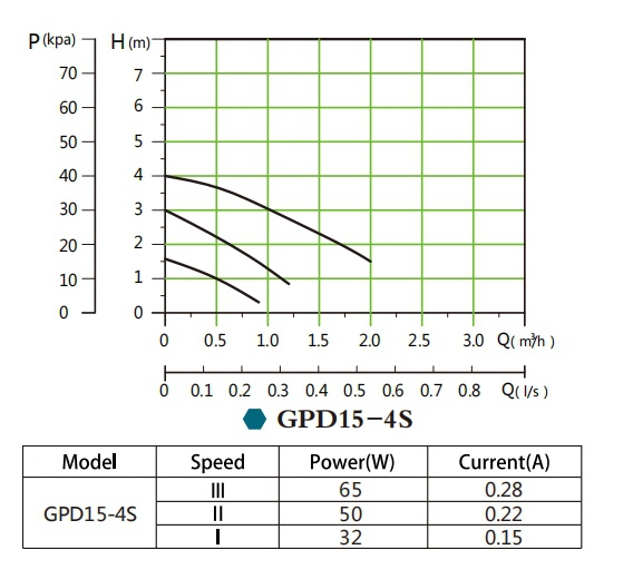 Modell Šifra Kriva Maksimalna visina (m) Maksimalni protok (m³/h) Snaga (W) Frekvencija (Hz) DN(mm) Napon (V)